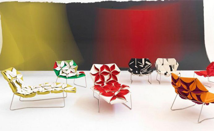 Antibodi 是 Patricia Urquiola 從一個花朵盛開的概念所創作的椅子,蜂窩式三角形花瓣串連縫製而成花朵散播在椅面上,片片花瓣的外型和多層次的材料,衍伸出豐富的圖案。