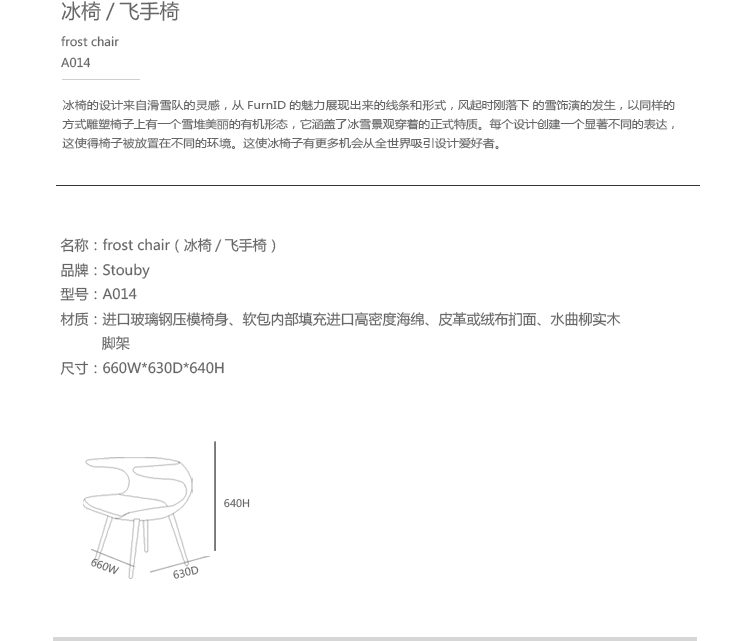 冰椅由来自丹麦哥本哈根的设计工作室FurnID的博·斯爵奇( Bo Strange )与工业设计师莫滕·克亚尔·斯达乌戈德(Morten Kjær Stovegaard)二人设计。 冰椅材质:优质玻璃钢椅身,外表是高级羊绒布料或意大利进口真皮;水曲柳实木脚(新改进)。这样的搭配让椅子重现经典的外观和未来的样子。