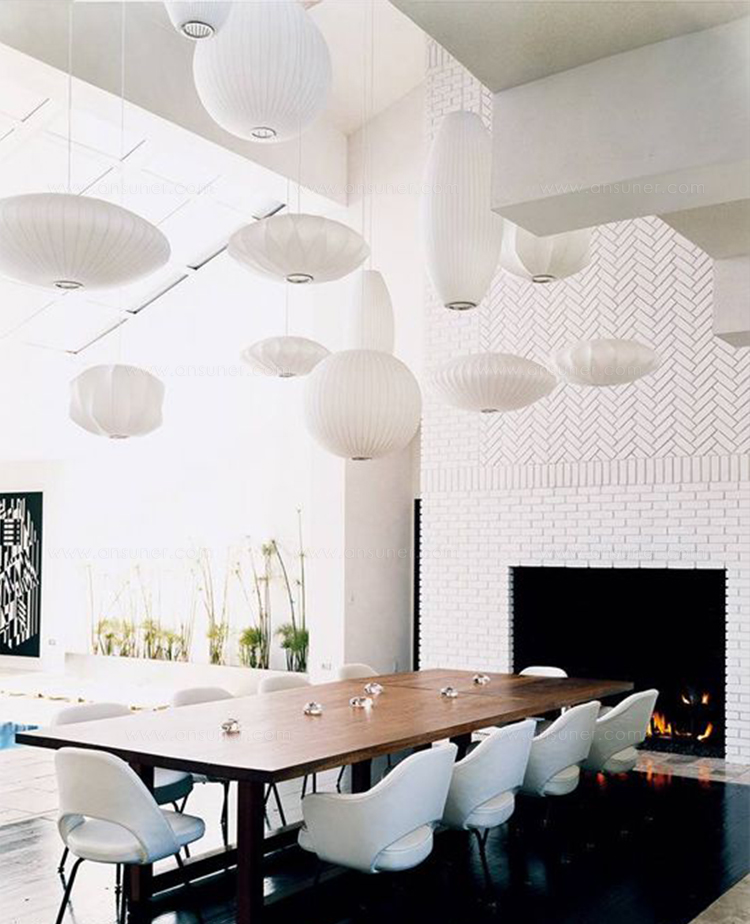 Nelson Propeller Bubble Pendant螺旋桨形气泡吊灯的下层结构中有许多棱角状的凹陷,外形十分醒目。这款雕塑般的吊灯配套有一个吊线板和将吊灯悬挂到天花板上的6英尺吊绳。Nelson最先于1952年设计了这些气泡灯,当时他偶尔碰到一组很喜欢的瑞典吊灯,想给自己的办公室买一套。“有一天,纽约的一家瑞典进口商品店Bonniers宣布对这些灯具进行促销。我带着办公室的一个伙计冲了过去,看到一款在商店里摆放了很久、上面满是手指印的样品居然标价125美金。”Nelson写到。这个价格在当时来讲太过昂贵,让Nelson萌生出自行设计的念头来。