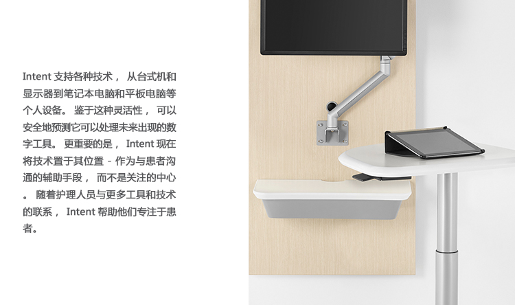 Intent Solution与综合墙系统。它们一起帮助检查室中的护理人员自然地使用各种技术——现在正在使用什么技术,接下来可能使用什么技术——因此它成为与患者交谈和保持谈话焦点的工具。这改善了每个人的经验,并建立信任。