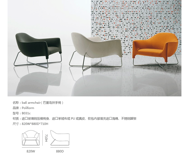 Bali Armchair(巴厘岛扶手椅)系列家具由著名设计师Carlo Colombo为Poliform所设计,包括扶手椅和脚踏。该系列家具根据最新的美学设计提供松弛的居坐度。制作采用光滑的不锈钢金属框架,进口玻璃钢压模椅身,高级羊绒布或PU或真皮、软包内部填充进口海绵,提供了绝佳的舒适度,是模块化及功能化的有机结合,提供多功能性的使用方式,与任何家具配合度都非常高。