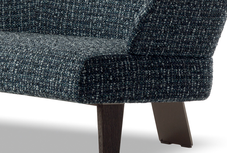 Creed “Lounge”沙发后方的地面支撑采用做工考究的弯曲金属架并搭配浅铜色亮光漆,前方支撑腿则为米灰色的鲍迪豆实木材质。支撑腿的上下方均采用精致的金属部件并搭配浅铜色亮面漆,用与众不同的细节设计来展现非同寻常的高超工艺。