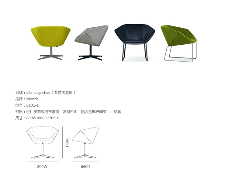 Ella Easy Chair(艾拉简易椅)由著名设计师Niels Bendtsen设计的。这把椅子是一个紧凑的座位让你采取的所有礼仪坐姿轻松而获得适当支持.一个显著的特点是它的扣盘形状,连同它的几何面两侧扶手椅给一个真正独特的外观.阀座完全由聚氨酯泡沫成型,具有特别高的耐久性.此款为四星脚架,采用进口皮革或绒布蒙面、发泡内胆、可自由旋转。