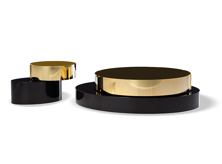 重叠的造型搭配珍贵的材质,这就是Benson的独特之处。木材的质感和金属的光亮感完美展现出雕塑般的造型。Benson边几可以直接放置在地面上,有两种不同的尺寸可供选择,以满足不同的功能需求。尺寸为120x95厘米的版本,基座为椭圆形,上方面板为圆形,配备的机械装置可以使其旋转360度,增强边几的延展性,使其更加靠近沙发座椅。直径为46厘米,高度为38厘米的版本,专门用于放置在沙发和扶手椅的侧方,有以下组合可供选择:一种是下方台面为亮面乌木,上方台面为亚光铜色板材;另一种是下方台面为Moka色亮光漆,上方台面为金色亮光漆。