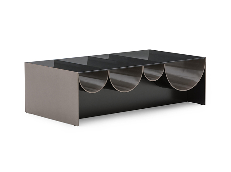 波浪咖啡桌是由一种烟熏的灰色玻璃制成的,它由一种漆成的铝结构支撑着,外面是一种沙子或浅青铜色的色调,里面有一种淡黄色的色调。