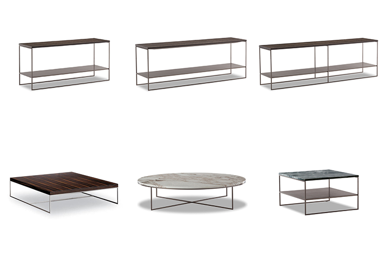 Calder家族有各种尺寸的边几和边桌,这一组全新的设计方案为其带来更为清新时尚的造型。铁架结构如今采用亚光浅铜色的表面。桌面也推出新版本:Sand色亮漆,米灰色的鲍迪豆木饰贴面,Bardiglio Nuvolato和Calacatta的大理石。中间层的桌面也为亚光浅铜漆面的金属。