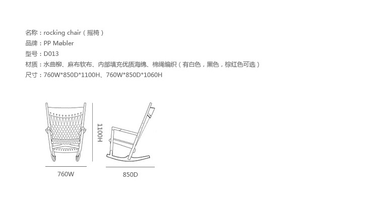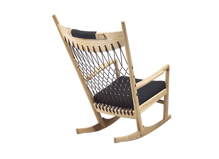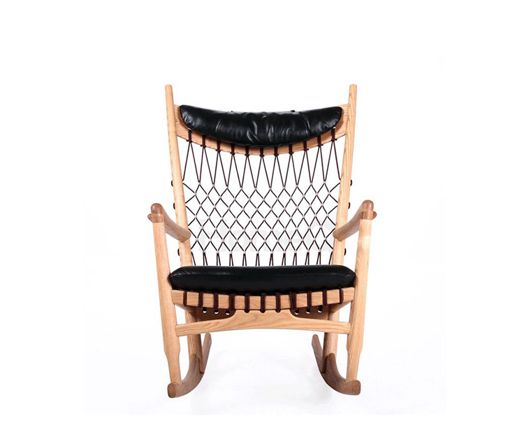 Rocking Chair(摇椅)是大师Hans J. Wegner设计的众多摇椅中的经典之作。摇椅具有简洁的线条,精准的的人体工学结构,是Hans J. Wegner在1944年为身怀六甲的妻子设计,扶手前端微微向外展开,是为让妻子方便起身。实木制成,轻便耐用,简约单纯,仍于潮流中立于不败之地,为Hans J. Wegner最受欢迎的经典作品之一。我们已经能从中感受到圈椅的影子。摇椅水曲柳制作,坐垫麻布软布(内部填充优质海绵),棉绳编织(有白色,黑色,棕红色可选)。