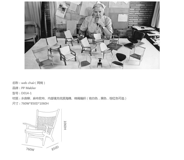 出富有表现力的安乐椅,实木作为主体,棉绳编织,麻布软布坐垫(内部填充优质海绵),这就是Web chair(网椅)。其顽皮和充足的扶手立即让人回想起Hans J.Wegner在塑造实木,体现不同理念的但坚持强烈舒适感的安乐椅上的喜悦感。Web chair(网椅)的设计也表达了Hans J.Wegner坚持艺术的完整性。"