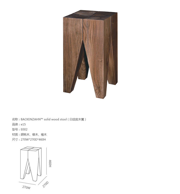 1996年推出的Backenzahn stool凳是Philipp Mainzer的成名作。第一个原型是橡木的桌子,腿部向桌面的过程就是一个由零到整的形态。“我们很开心的去将整块的树桩买回来,中心的部分因为水分的流失会断裂,但那种效果就是我们想要的。”和自然产生的形态相结合,是Philipp Mainzer设计中的重要理念。而要做到这一点,工艺也是不可忽视的部分。这点Philipp Mainzer和许多设计师朋友有共鸣。与e15品牌合作过的设计师Stefan Diez在设计记者Maria Cristina Tommasini采访他时说:“我个人是对大量生产过程中那些应用技术非常感兴趣的,但是随着时间的推移,我越来越认为这样的制造只是对于极少数的大型公司而言,过去我们被告知大量生产可以提供价廉物美的产品,但是如今的世界并不是这样,物质太丰富,产品的更新换代时间越来越短,反而那些使用昂贵的材料、优质的工艺的产品最后会被留下来。”这个想法和Philipp Mainzer对设计品的态度一致。他认为,材料、工艺是贯穿e15所有产品的特点,产品应该是可以无限期使用的,产品和空间都应该是真实和诚实的。这就解释了在极致简洁的外表下,e15的产品总是使用昂贵的材料如大理石、贵金属、实木等。