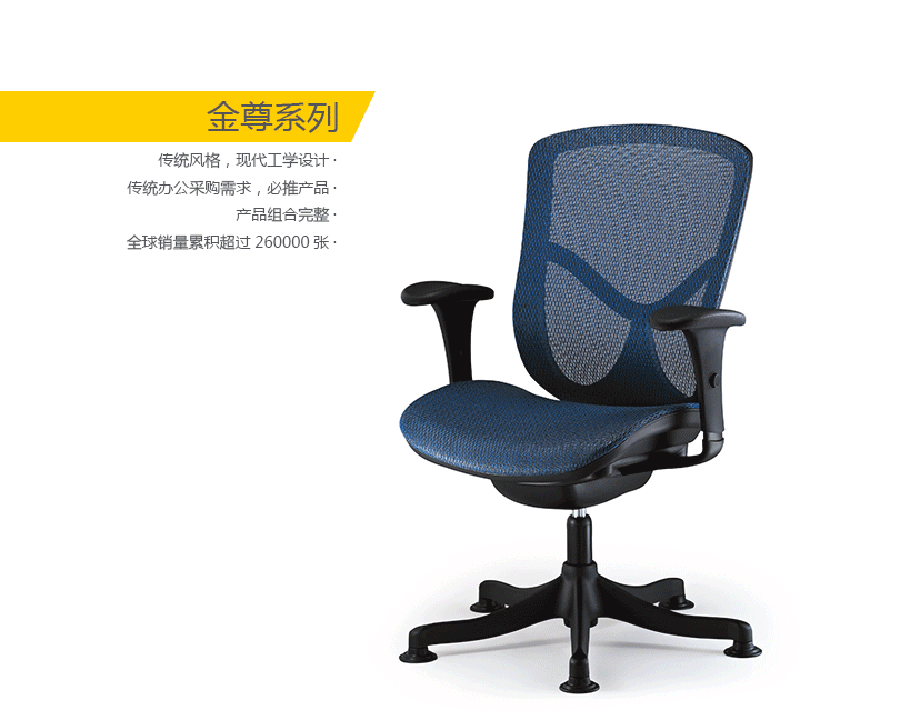 金尊的唯美设计有利于持久的舒适和美感。人性工学椅的结构和功能利用同步倾仰底盘控制功能锁定,滑座和高度调节。高度和角度均可调的扶手和头枕都包含在这张独一无二的工学椅里。