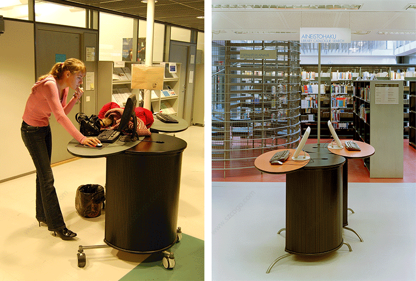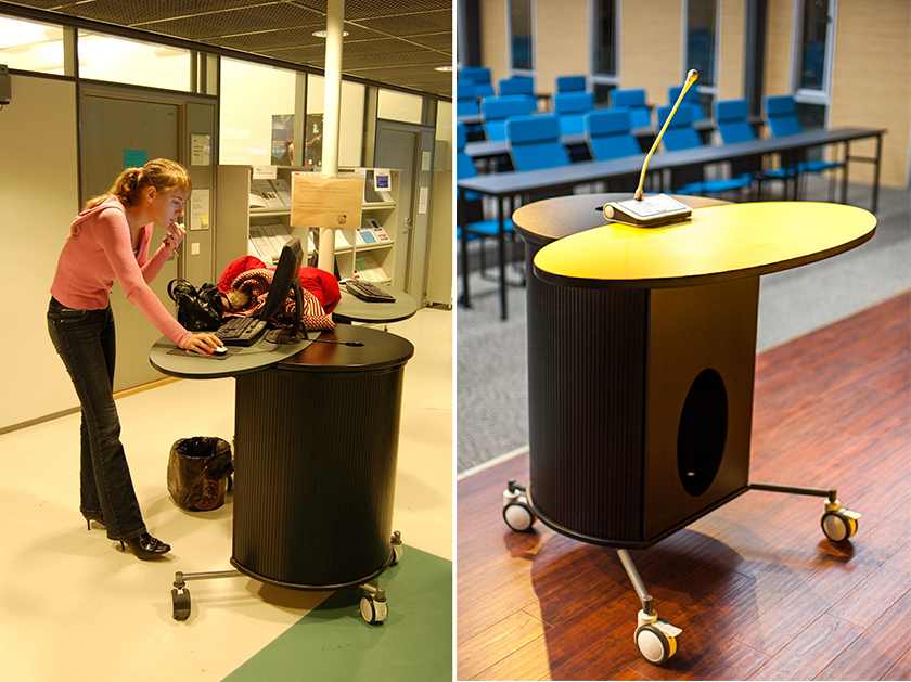 乔尼 · 雷诺于1999年设计开发了万维,专为放置电脑而用。造型设计突破传统束缚,卷帘门和活动轮的使用,便于开启做设备维护和移动使用。它在功能使用上不断增强性能,无论在办公室、公共查询区域和居家环境下,都可以合理使用。