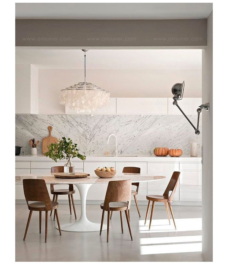 Tulip Dining Table(郁金香餐桌)是芬兰裔美国设计师Eero Saarinen在1956年设计的作品。优雅、清秀的桌脚配上天然的大理石桌面,极简却又完美。Tulip Dining Table(郁金香餐桌)是现代餐桌的代表作,作为家庭中使用餐桌、高档饭店中的餐桌和酒店中使用的餐桌都非常合适。作为著名家具设计师设计的作品设计品位自然不会低,这种餐桌设计出来的时候就被广泛的运用到了饭店、酒店和家庭中,成为当时最热销的餐桌之一,餐桌主要材料是玻璃钢(可选大理石),整张桌子是采用一次成型,中途不会出现裂缝,有质量保障,桌面平滑不会凹凸。