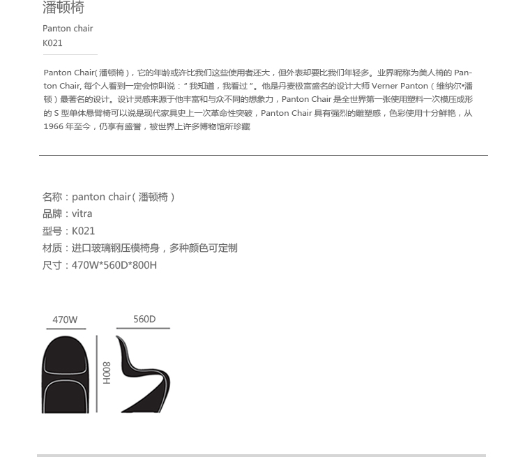 Panton Chair(潘顿椅),它的年龄或许比我们这些使用者还大,但外表却要比我们年轻多。业界昵称为美人椅的Panton Chair,每个人看到一定会惊叫说:“我知道,我看过”。它是丹麦极富盛名的设计大师Verner Panton(维纳尔·潘顿)最著名的设计。设计灵感来源于他丰富和与众不同的想象力,Panton Chair(潘顿椅)外观时尚大方,有着流畅打钱的曲线美。Panton Chair是全世界第一张使用塑料一次模压成形的S型单体悬臂椅可以说是现代家具史上一次革命性突破,Panton Chair具有强烈的雕塑感,色彩使用十分鲜艳,从1966年至今,仍享有盛誉,被世界上许多博物馆所珍藏。
