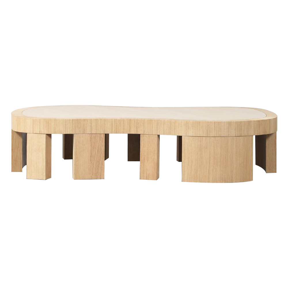 大胆的无定形罗德咖啡桌采用整体式黑檀木和拉丝橡木框架,与实心四分之一木质顶部和整体式腿部的光滑表面形成鲜明对比。