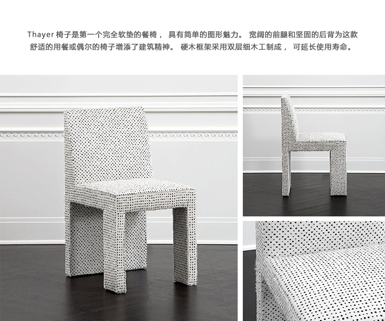 Thayer椅子是第一个完全软垫的餐椅,具有简单的图形魅力。 宽阔的前腿和坚固的后背为这款舒适的用餐或偶尔的椅子增添了建筑精神。 硬木框架采用双层细木工制成,可延长使用寿命。