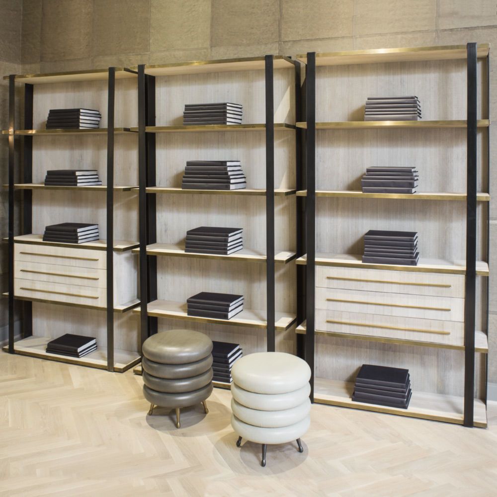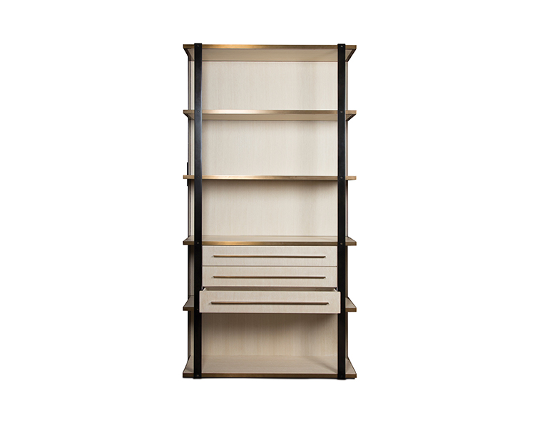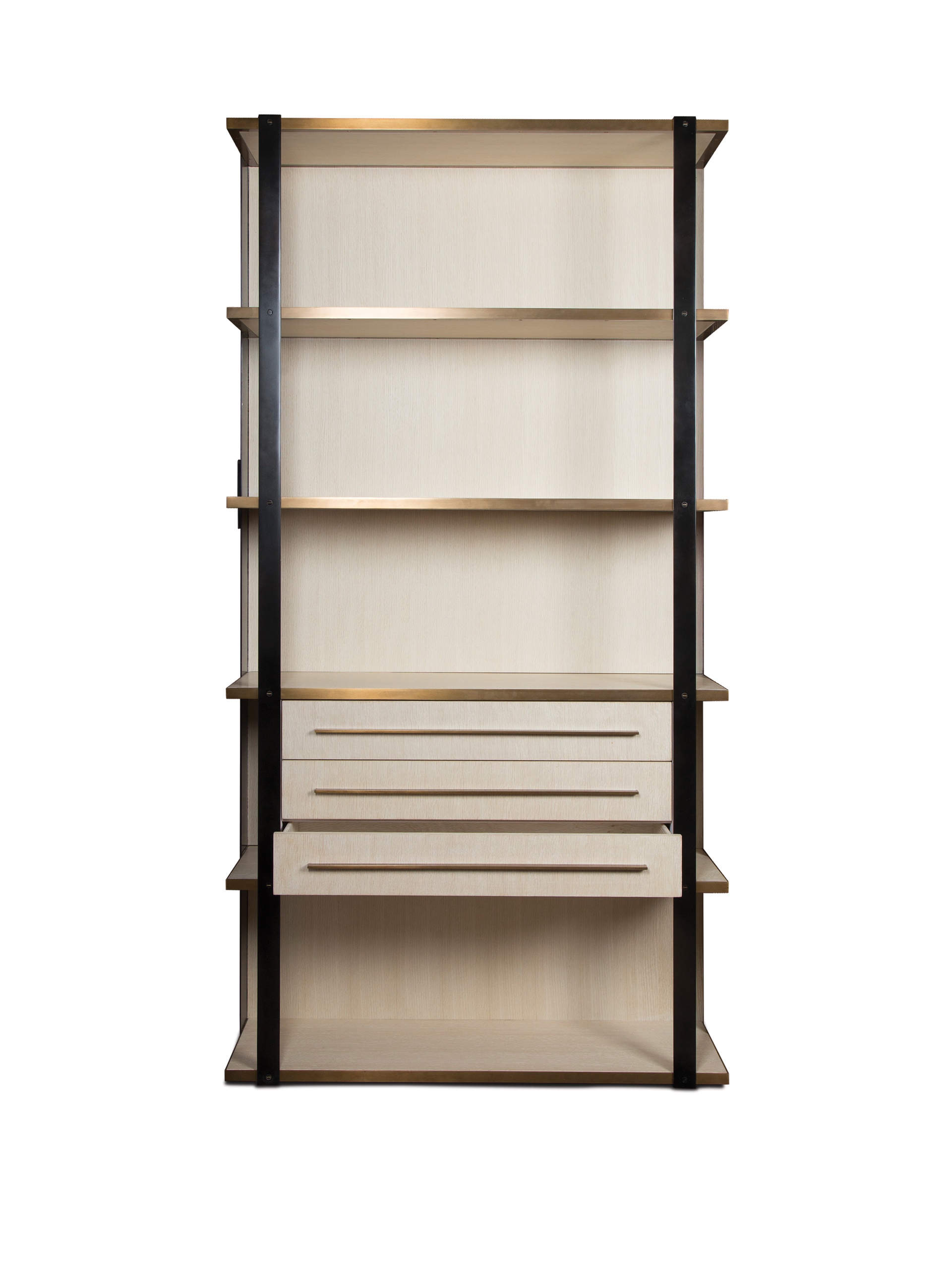 凭借Kelly对混合金属和材料并列的喜爱,富兰克林橱柜由黑色钢架,漂白的胡桃木制成,架子上饰有抛光青铜。 橱柜配有三个抽屉,四分之一英寸铣削青铜拉手,外观大胆,精致,现代。