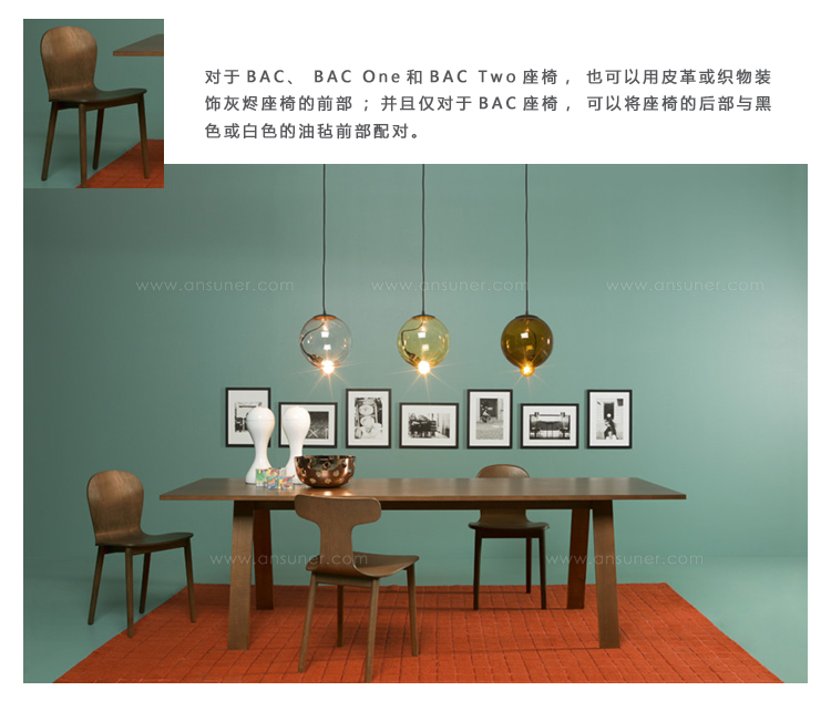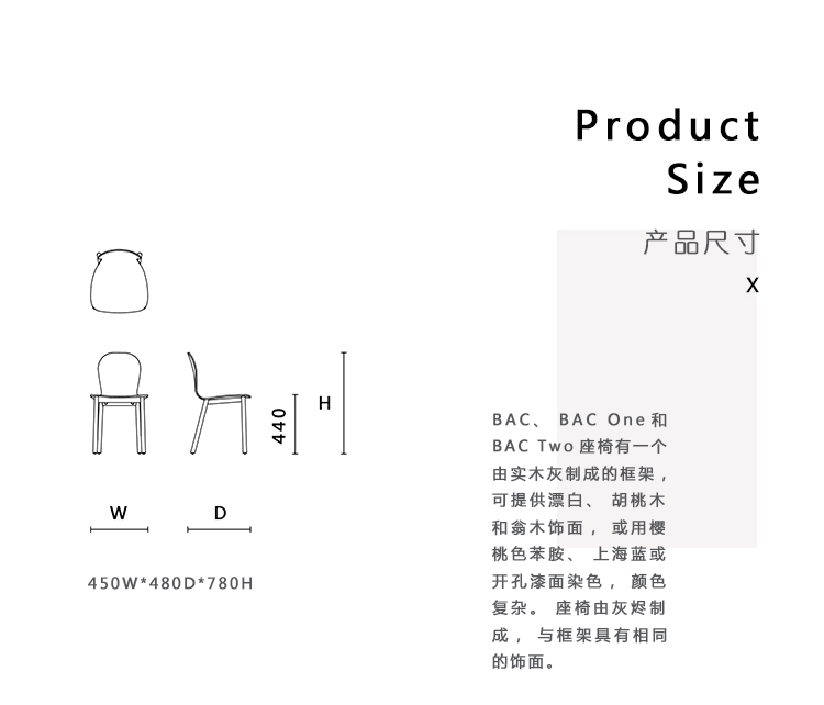 BAC、BAC One和BAC Two座椅有一个由实木灰制成的框架,可提供漂白、胡桃木和翁木饰面,或用樱桃色苯胺、上海蓝或开孔漆面染色,颜色复杂。座椅由灰烬制成,与框架具有相同的饰面。