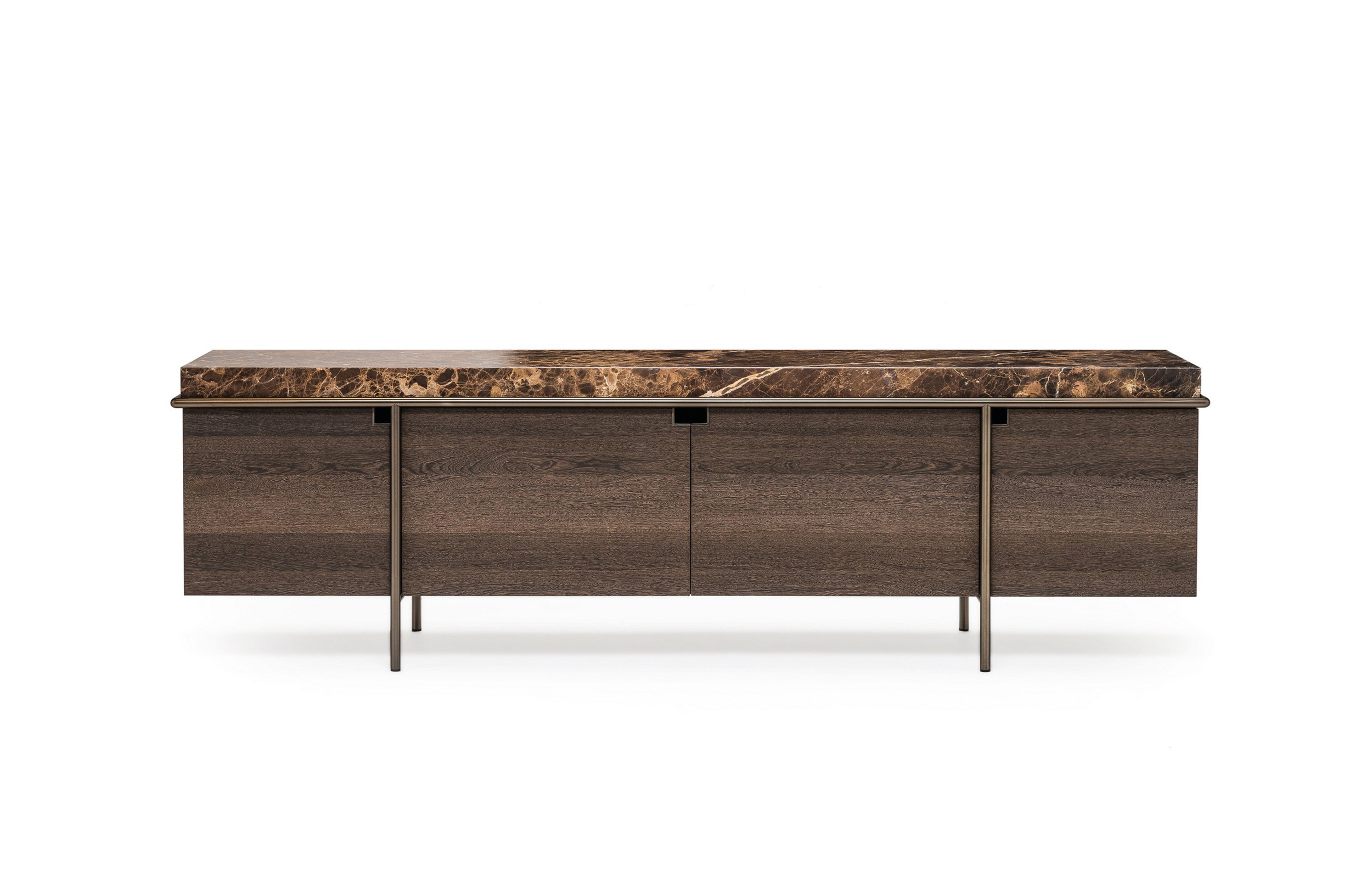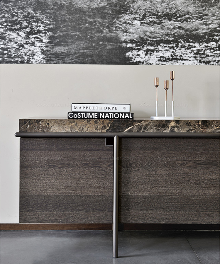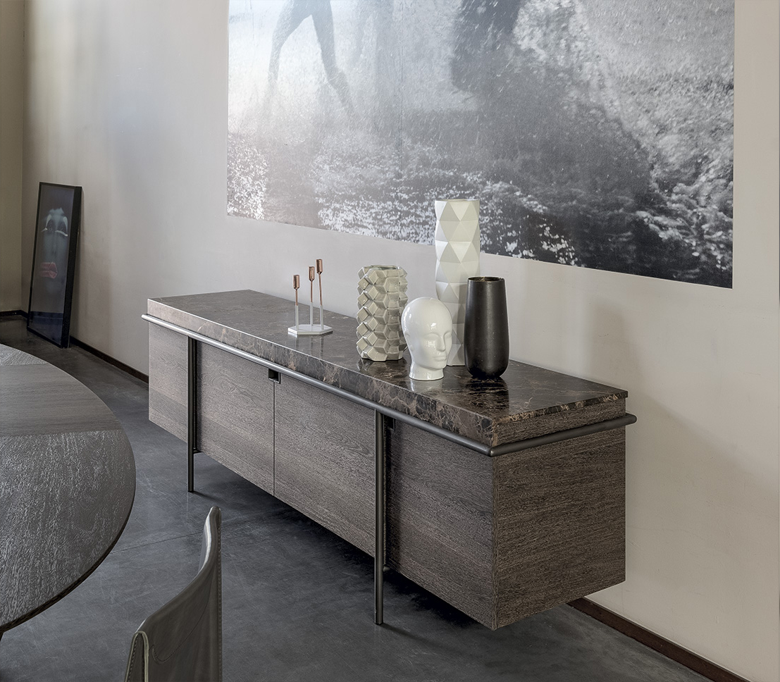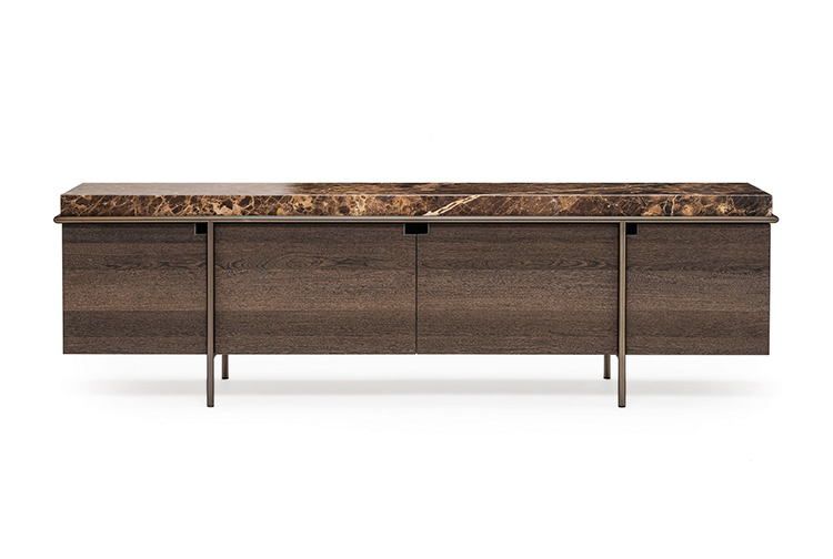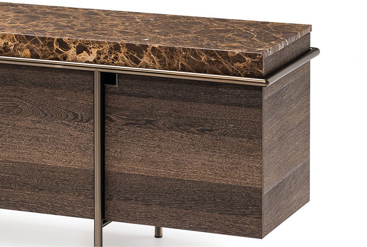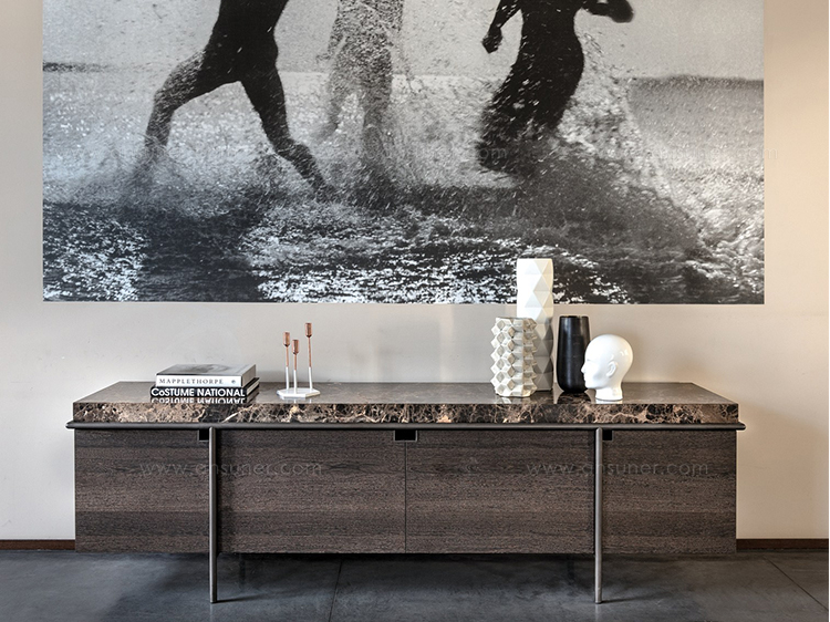 干净而严谨的外形特征是Aura餐具柜的特征。纯粹与几何灵感之间的相互作用是为了创造出一种具有独创性和优雅风格的设计作品。它的顶部是由大理石或蚀刻玻璃制成的,实木柜身漆成灰色或者棕色,由云母棕色、黄铜、钛或氧化灰色的金属管包裹。视觉效果是一个有着丰富而坚定的个性的形象。