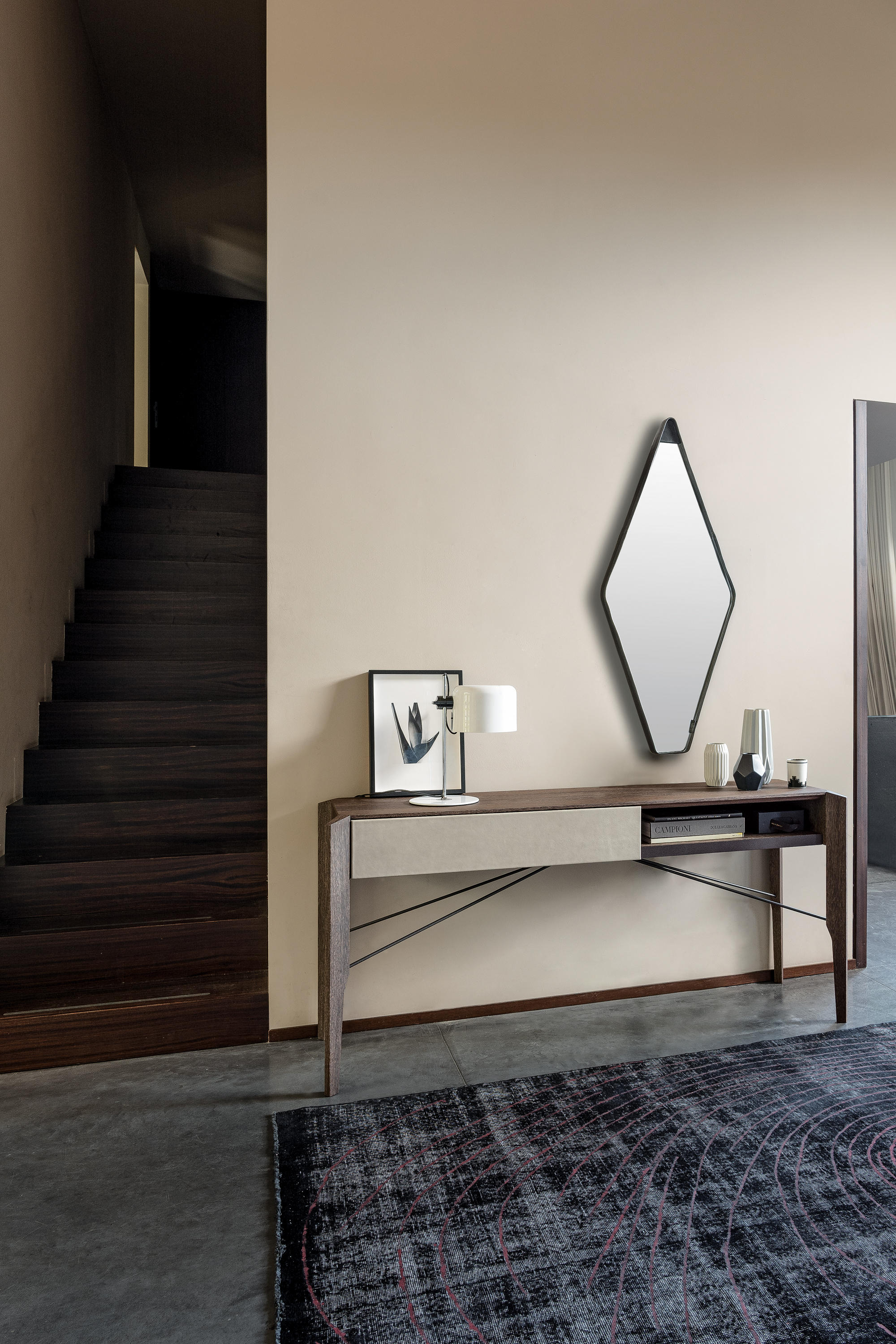 Manzoni & Tapinassi装饰柜的侧板可以在摩卡橡木、卡纳莱托胡桃木或苏皮亚木上选择制作,金属框架由云母褐色或镀锌钛制成。虽然它的结构看起来很薄,却起到了很好的支撑作用。