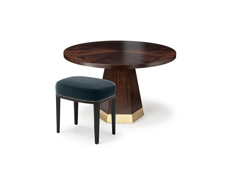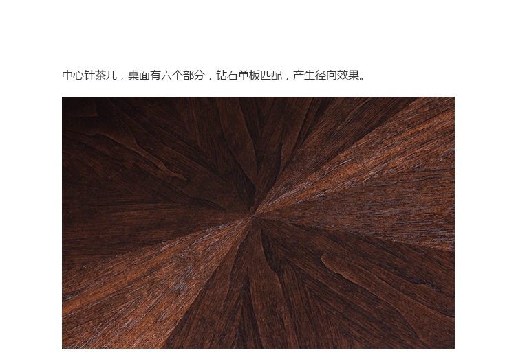 中心针茶几,圆形桌面和圆锥形六角棱柱底座。 桌面有六个部分,钻石单板匹配,产生径向效果。