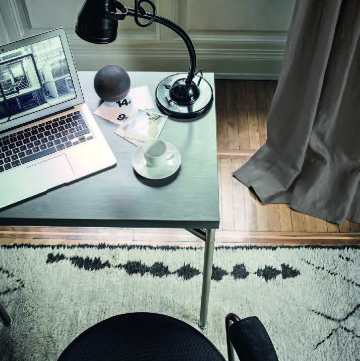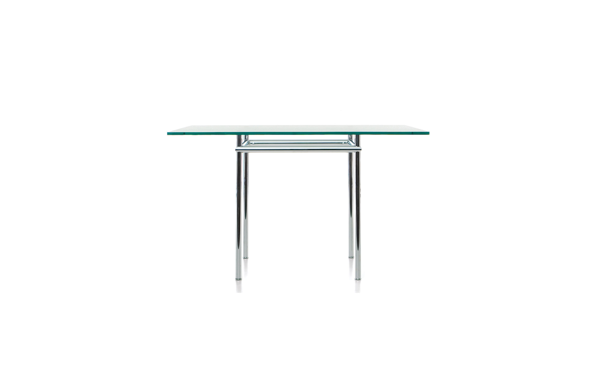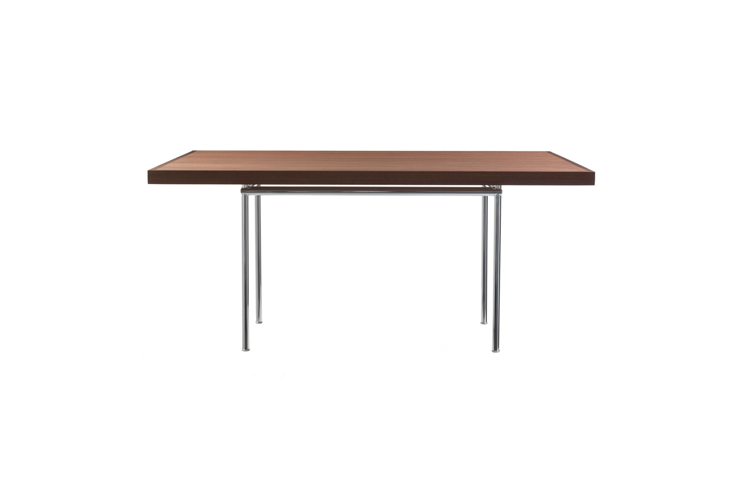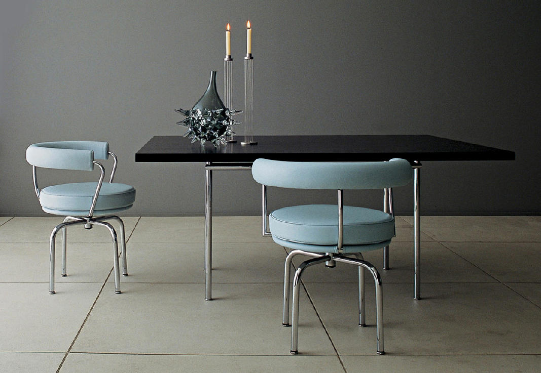 矩形桌,采用CR3三价镀铬钢结构或浅蓝色哑光珐琅钢架。桌面选用50mm厚的胡桃木或15mm厚的晶质或网纹玻璃。有2种尺寸的矩形桌面可供挑选:160x120 cm或120x80 cm,这款于1925年为La Roche House设计的桌子为不同位置带来了解决方案。他们的精髓在于支撑和被支撑两个元素之间的比例对比,也就是说:垂直形状的桌腿的最低宽度以及水平方向桌面的最大宽度。Le Corbusier的其它设计中也强调尺寸关系的对比,确认存在塑料诗意的优点,普遍通过元素角色反演、桌面与实际重量的振动大小以及桌腿与视觉精美的舒适稳定度进行表达。