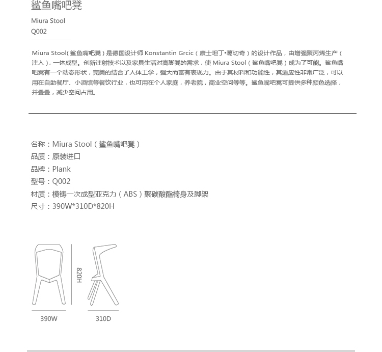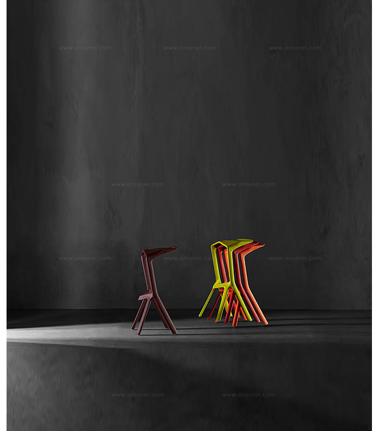 Miura Stool(鲨鱼嘴吧凳)是德国设计师Konstantin Grcic(康士坦丁·葛切奇)的设计作品,由增强聚丙烯生产(注入),一体成型。创新注射技术以及家具生活对高脚凳的需求,使Miura Stool(鲨鱼嘴吧凳)成为了可能。鲨鱼嘴吧凳有一个动态形状,完美的结合了人体工学,强大而富有表现力。由于其材料和功能性,其适用性非常广泛,可以用在自助餐厅、小酒馆等餐饮行业,也可用在个人家庭,养老院,商业空间等等。鲨鱼嘴吧凳可提供多种颜色选择,并叠叠,减少空间占用。