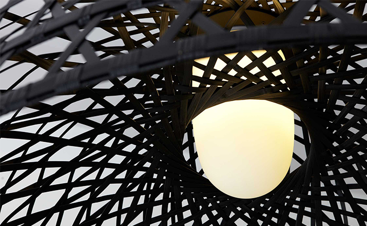 "This oversized light was inspired by a made-believe folklore story of an Asian emperor & a beautiful nightingale…Once upon a time an Asian emperor was given a nightingale as a gift. The bird was so beautiful and sang in such a bewitching way that the emperor fell immediately in love with it and decided to keep it forever by his side. So the nightingale was put in a beautiful, majestic cage in the imperial chambers & became the delight of the emperor's days…Neri & Hu took on a modern translation of this story and produced a collection of pendant/floor/table lamps in stained woven bamboo. The poetics of an emperor's life, a life no longer relevantin today's world, can be abstracted in the form of an object such as the light. The use of hand-crafted bamboo weaving in an industrial product creates an elegant yet uncanny design statement. A lamp so particular & majestic that it could become your personal nightingale forever by your side to brighten up your days.The Emperor collection includes suspension, floor and table lamps. They are offered with a glass diffuser that creates a very warm glow of light. Each cage is woven by hand and therefore has a unique character. Touch dimmer on table lamp is operated by touching the stem.