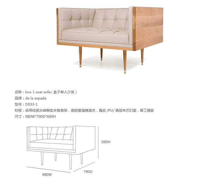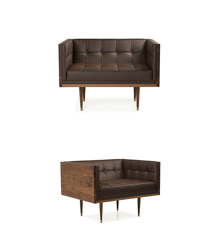 Box Armchair,inspired by the 1950's modernist movement,has the pure shape of a box.The inner face of the solid wood form offers refined comfort with crisp upholstery and classic tuft detailing. The four supporting legs appear to be impossibly slender,creating a stunning profile.Designed by Autoban and manufactured by De La Espada for the Autoban brand.