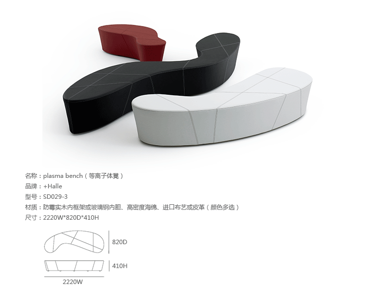 Plasma bench(等离子体凳)是丹麦设计师busk+ hertzog为Halle品牌创作的。Plasma是一个弯曲的概念性的公共座椅。等离子体凳的功能性能非常完美的融入环境,可以单独使用,也可以以不同的组合形式去营造独特、与众不同的空间。4种不同大小尺寸使之很容易表达功能性和各种可能性。最大的等离子体凳超过三个半米长,同时允许多达 10 人的就坐。有机的形状在功能性上表现出强烈的优点,例如大家可以面对面,也可以背对背,可以保持近距离交流,也可以保持一定的私人独立空间。可选的对比拼接提供独特的创造性的组合。Plasma bench(等离子体凳)是IF Design Award和The Good Design Award获奖作品。