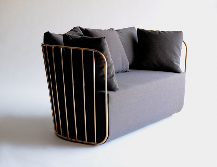 "The Bride's Veil Stool family’s unique language is meant as a graceful alternative to the archetypal bar stool.The double stool is the perfect solution for you and your date to enjoy sitting together uninhibited by separate stools.The strikingly elegant metal base is available in smoked brass,polished chrome,burnt copper,or powder coat,while the top is offered in COM upholstery.At every angle these stools offer a visual treat."