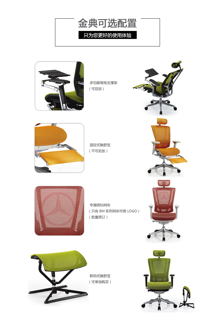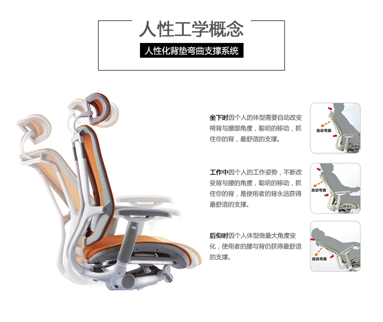 人性化背垫弯曲支撑系统,坐下时因个人体型需要自动改变椅背与腰部角度,聪明的移动,抓住你的背,提供最舒适的支撑