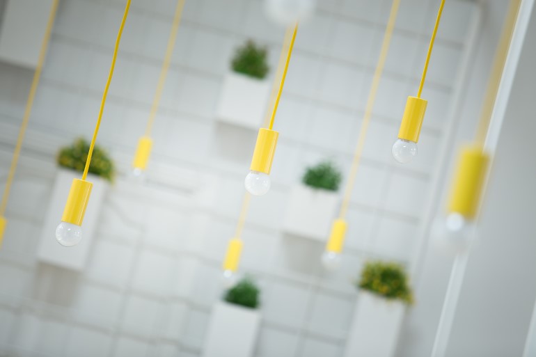 三个洗手间分别设计成三种主题色彩,并以各自的色彩灯具来搭配。小小的空间却处处彰显着精致与创意。