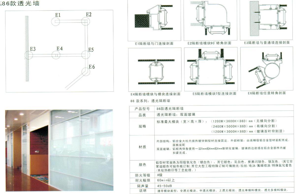 材料说明:银白色铝框(常规色)、12mm钢化清玻设计说明:为了让设计不显得单一呆板,高隔断系统可以灵活地相互搭配使用,也是让客户在方案上有了更多的选择,比较典型的搭配是:86款双面,边上配以40款单玻,如图中显示。 |