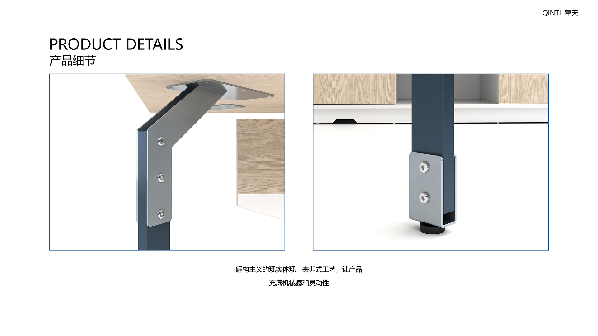 擎天之势,能撑天,看似柔弱,实则刚强,简洁的双头夹卯结构配以经典色彩,让产品更加灵动!标准化模块式设计,只要我们能想,就有无限的可能。产品回归本质,用最简洁的组合,完成让人充满期待 的适用功能。解构主义的现实体现,夹卯式工艺,让产品充满机械感和灵动性