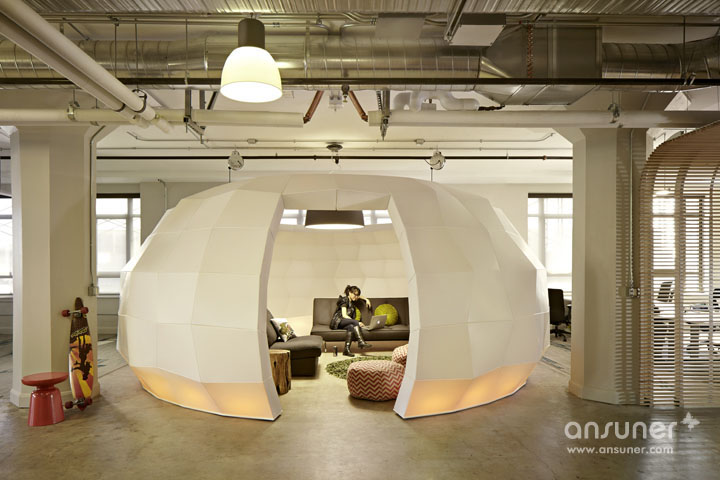 Runway社区,新兴创业者的孵化基地。设计的挑战在于如何将其打造成一个热情且具特色的办公空间,使其在众多同行中脱颖而出。设计团队以前卫的设计概念将这座位于Twitter大楼占地30,000平方英尺的孵化基地打造成一个时尚的社区,而非仅用以工作的办公场所。刚起步的创业者可租用一套桌椅或400平方英尺的区域空间。
