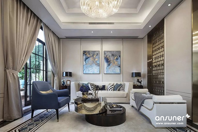 客厅整体空间为浅色系,线条简洁硬朗,象牙白的背景色,奠定了空间低调的质感、优雅的基调。设计师采用大量高级皮质材料,巧妙搭配自然质感的石材以及金属元素,璀璨的金色和几何经典,给予色彩最大的礼赞。流光溢彩的水晶吊灯尽显奢华,恰如一个浪漫的音符,赋予空间生动轻灵的魅力。