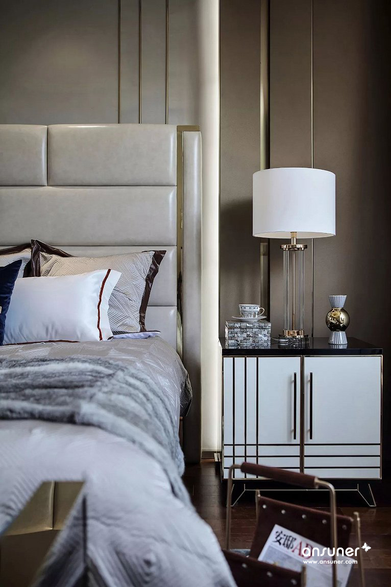 主卧组合了丝绒面料、马毛地毯、精致水晶、尊贵皮质等现代元素,呈现出品质生活的现代追求。设计灵感来自被誉为不夜城的“New York City ”,并巧妙介入都会元素,塑造出让人迷恋的简洁、奢华与雅致,让我们仿若置身纽约曼哈顿,沉浸在时尚优雅的都市氛围中,享受现代人心之向往的自由与洒脱。
