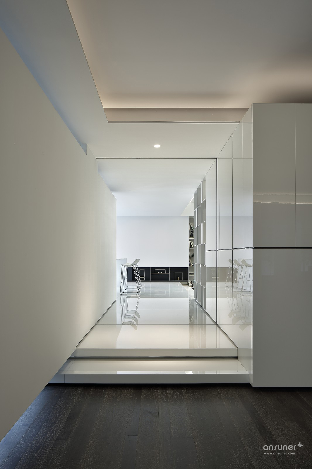 极简设计下,纯净的白色从顶面、墙面一直延伸到地面在单一色调中,以简明的线条,勾画出空间棱角。