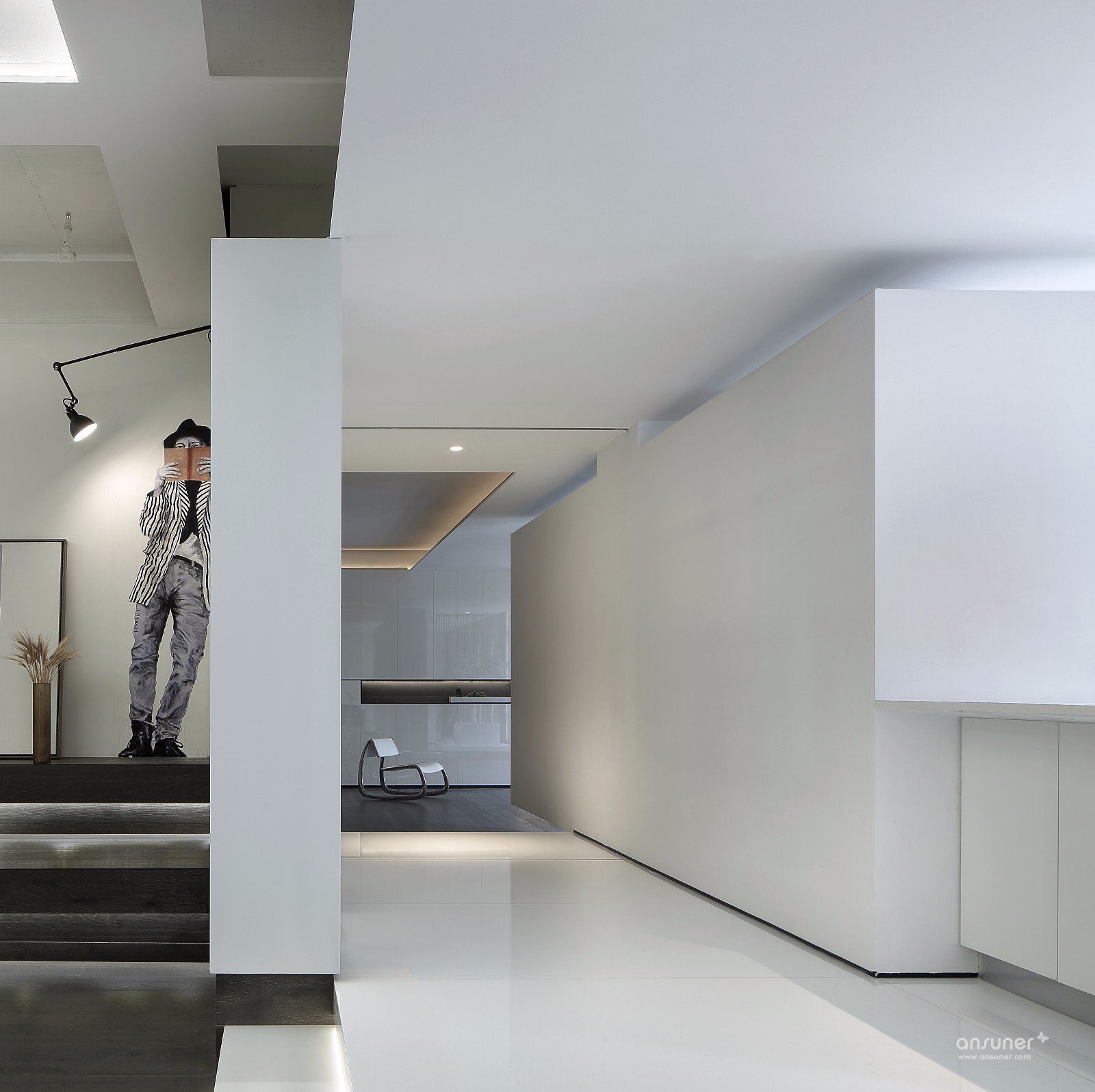 门厅接待区的视觉呈现,表述空间设计的构想初心。设计并未沿用对称、均衡的常用手法,而是以错位、悬拉的三面白墙,细分空间三重场域。