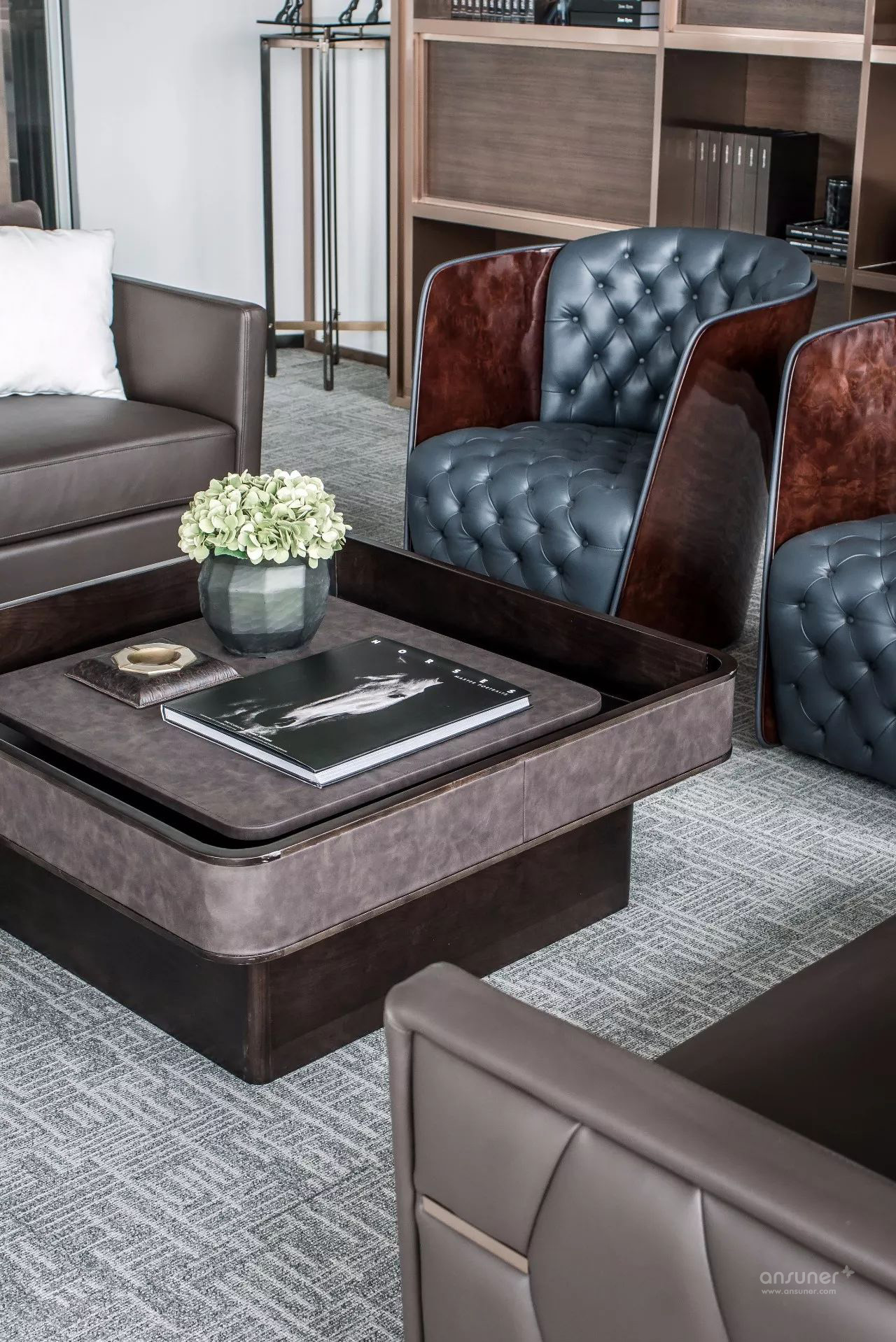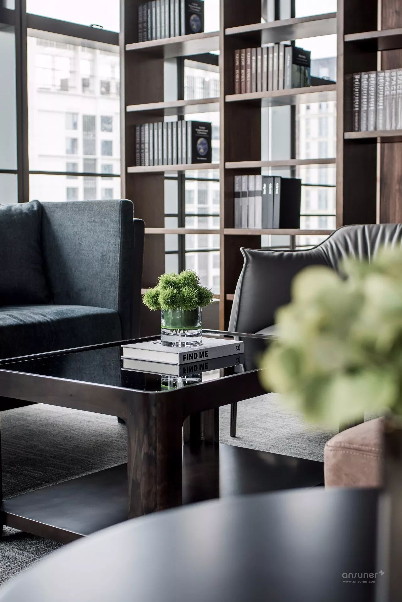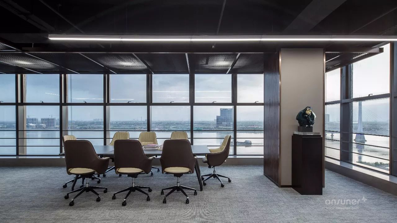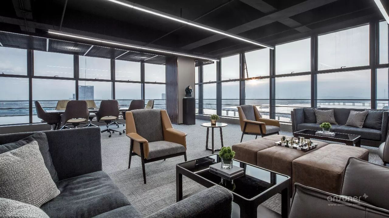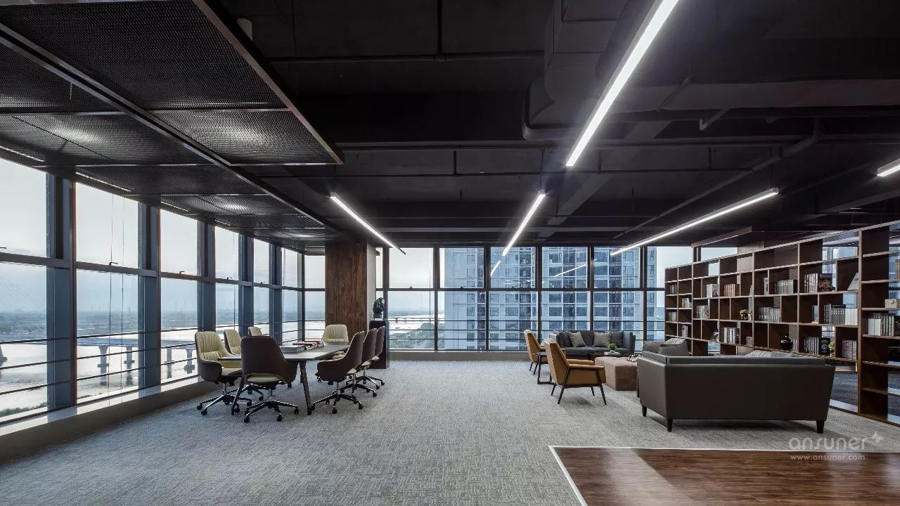 临江美景尽人眼帘,以书架进行自然切换,不同质地、色彩的座椅、沙发的组合不再强调位序,体现平等沟通、自然协作,以满足各种会议形式的需求,完成从我到我们的弹性交互。