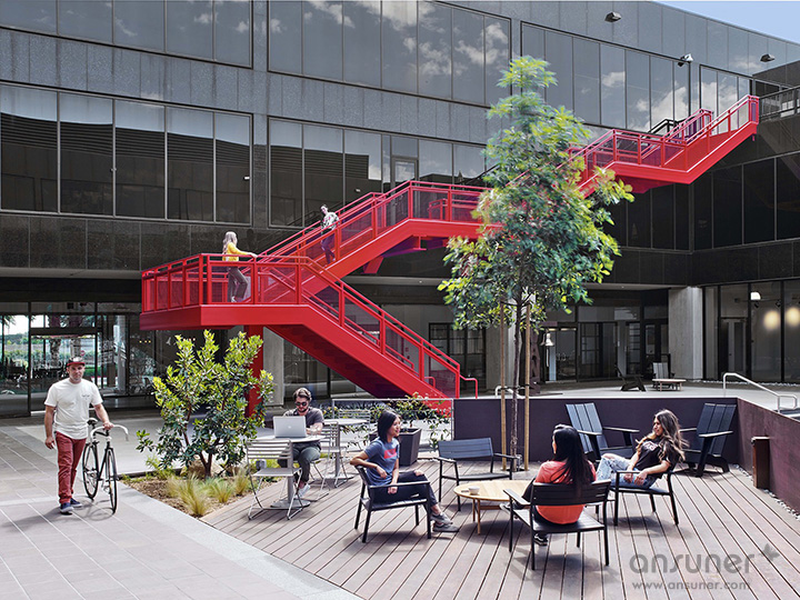 Vans 的全球总部非常炫酷,这里就像是橙县的一小块硅谷,孕育着各种无限的可能。总部占地14英亩,为品牌的发展演绎和未来成长提供了充足的空间。办公建筑围绕一处大型开阔的中央庭院而建,标志性的红色楼梯成为露天庭院最显眼的装饰,连接起每个楼层的咖啡厅,以及三楼的露台烧烤和中央庭院。