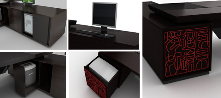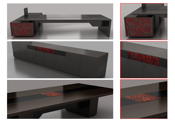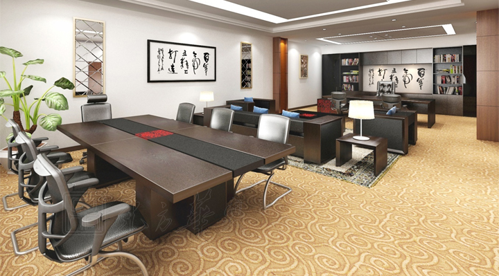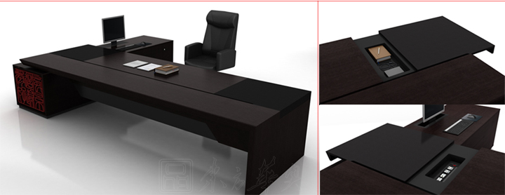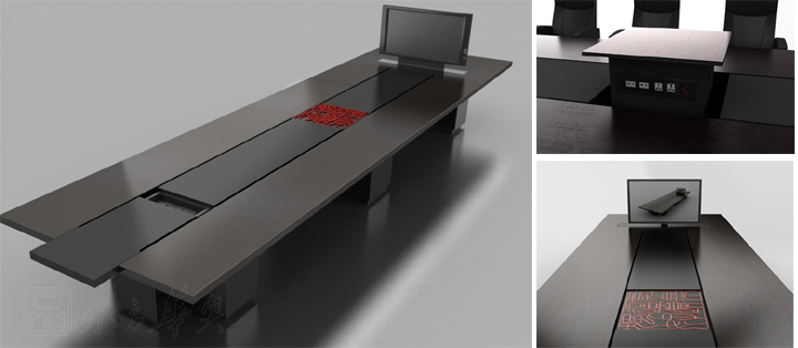 wood and the combination of high-tech, using touch intelligent drawing cabinets, hide desktop type stationery box and walk the line, the springback mute damping sliding rail, electronic smart lock, multifunctional pleasant office equipment, HD ultrathin conference display screen, electric seat. Maximize the embodiment of Chinese intelligent, humanization. Electronic control, automatic lifting